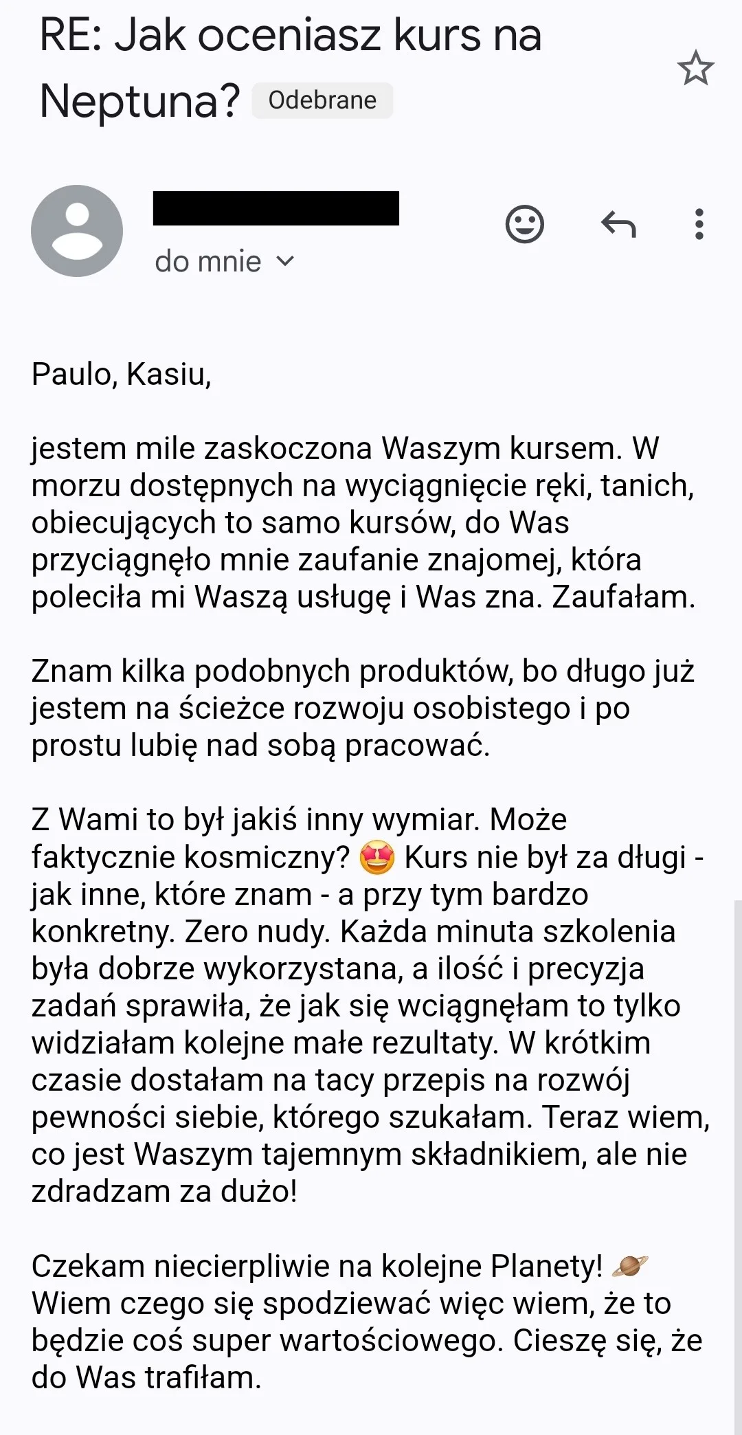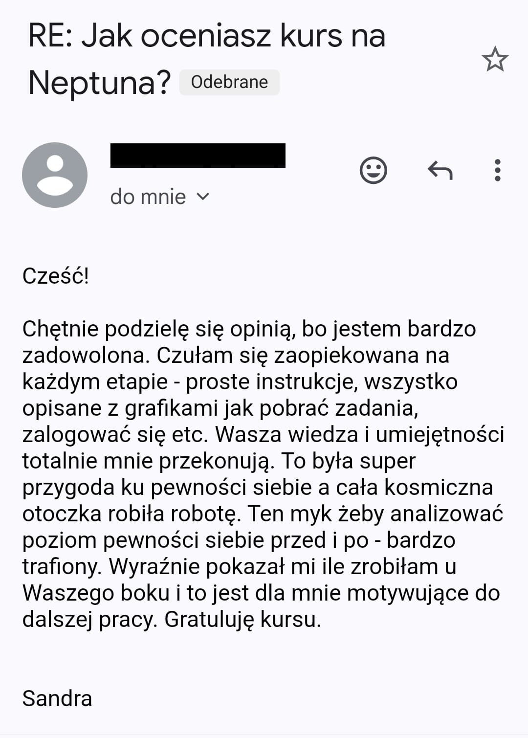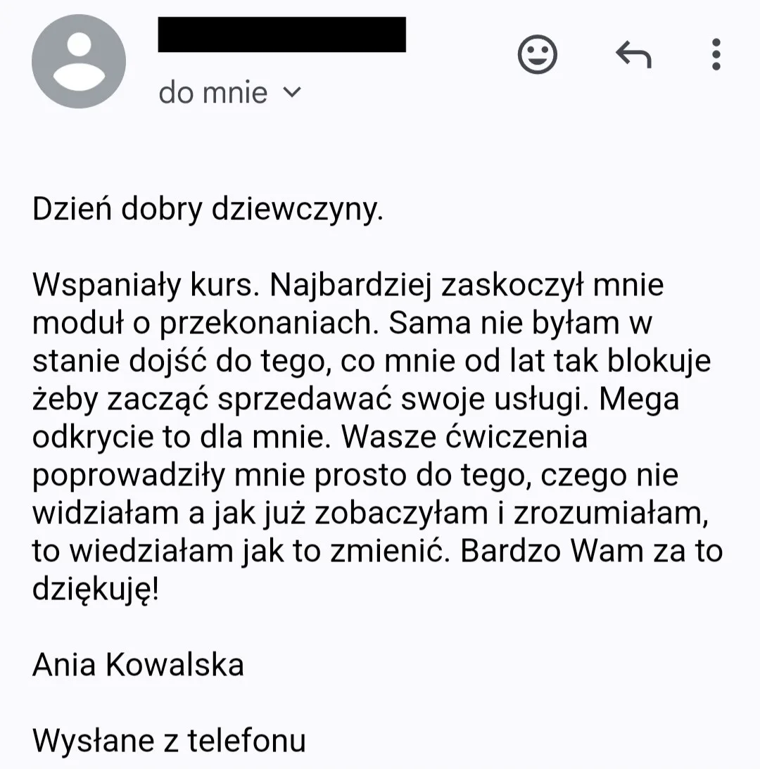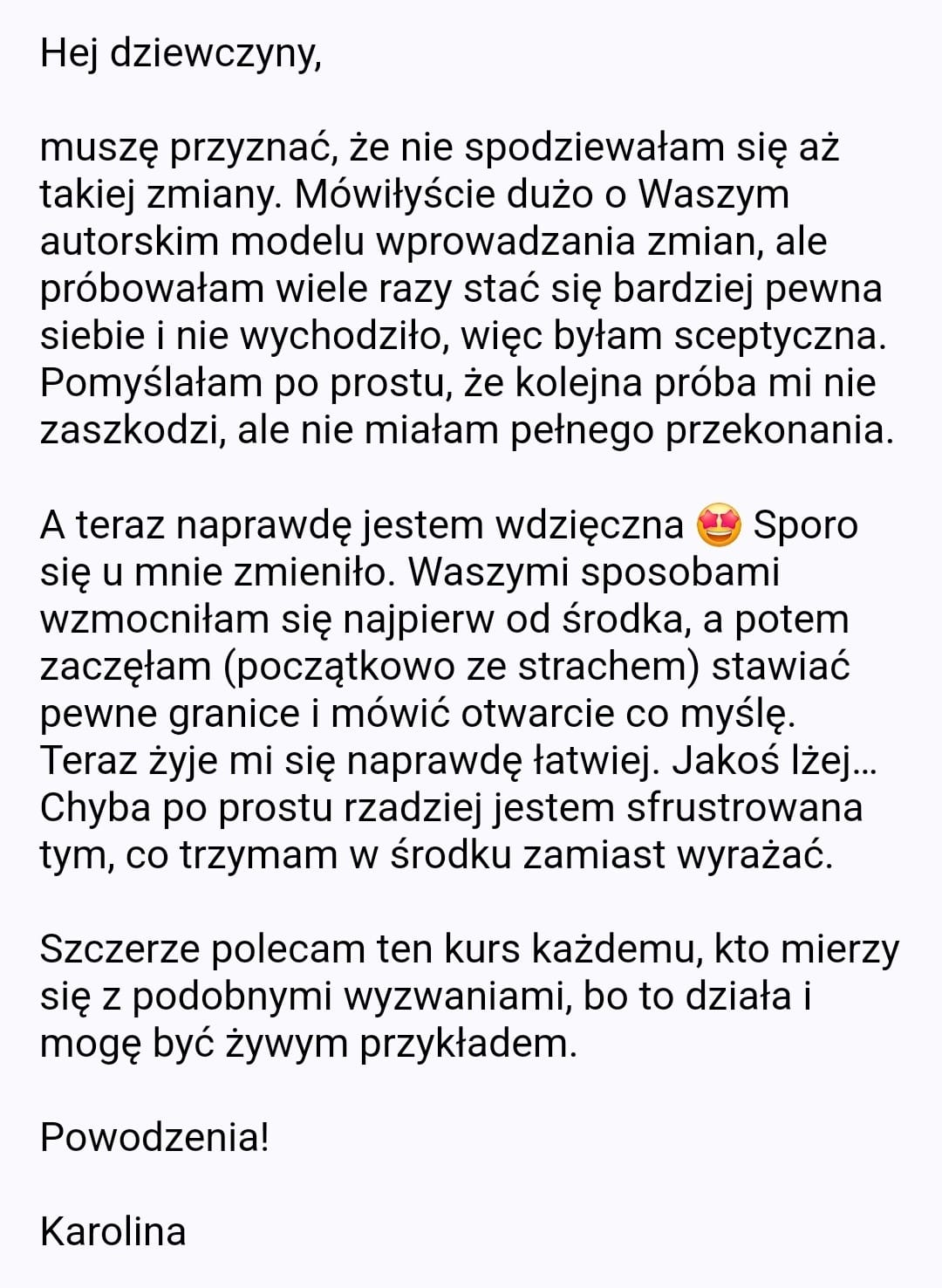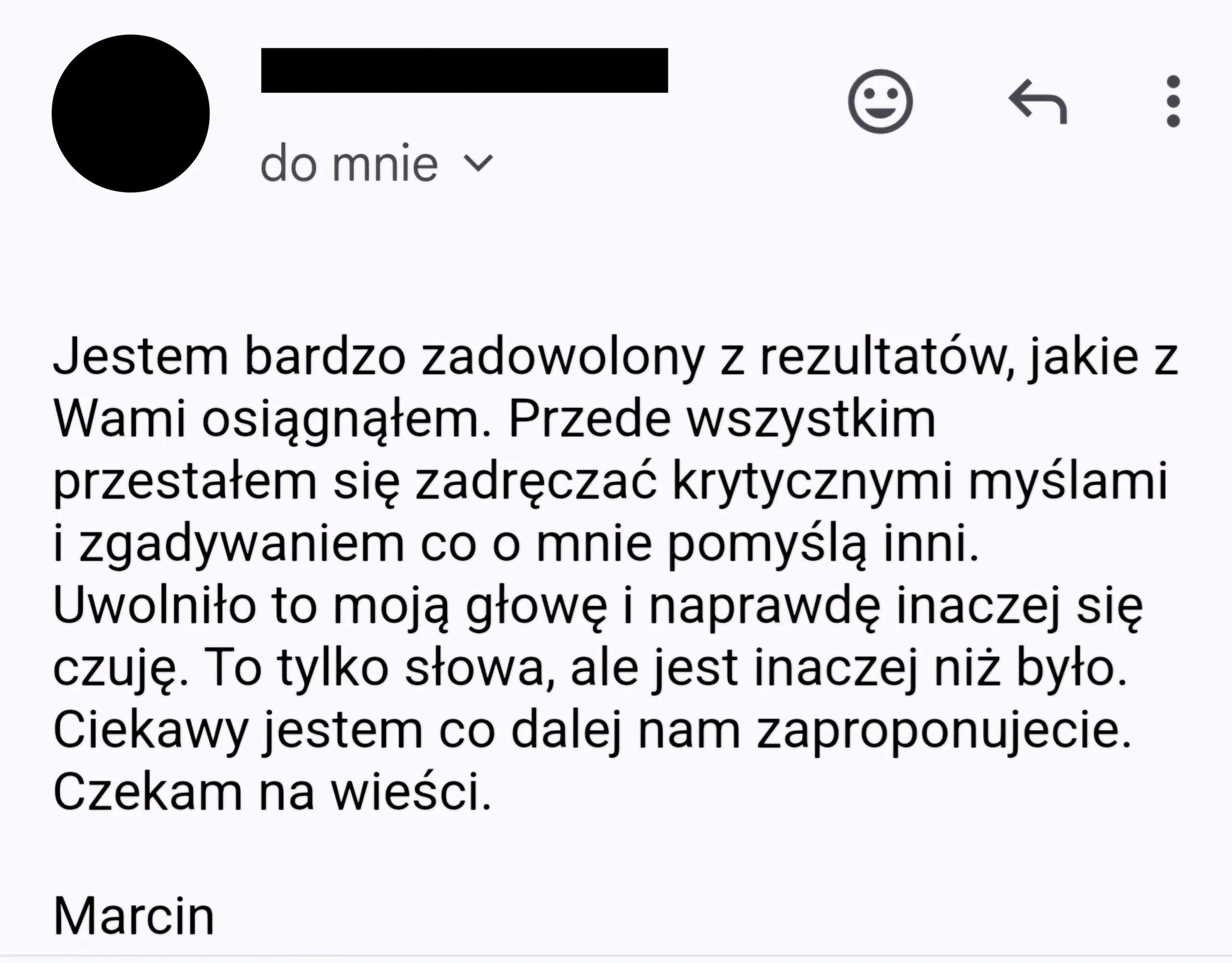 „W Waszym kursie zrozumiałam, że zawsze miałam problem z wewnętrznym krytykiem, który powstrzymywał mnie przed podejmowaniem wyzwań. Kurs pomógł mi zrozumieć, że nie są moimi wrogami. Uczę się co mi mówią. Ćwiczenia pozwoliły mi zmierzyć się z lękiem przed negatywną oceną, który wcześniej wydawał się nie do pokonania. Poczułam po prostu ulgę.”