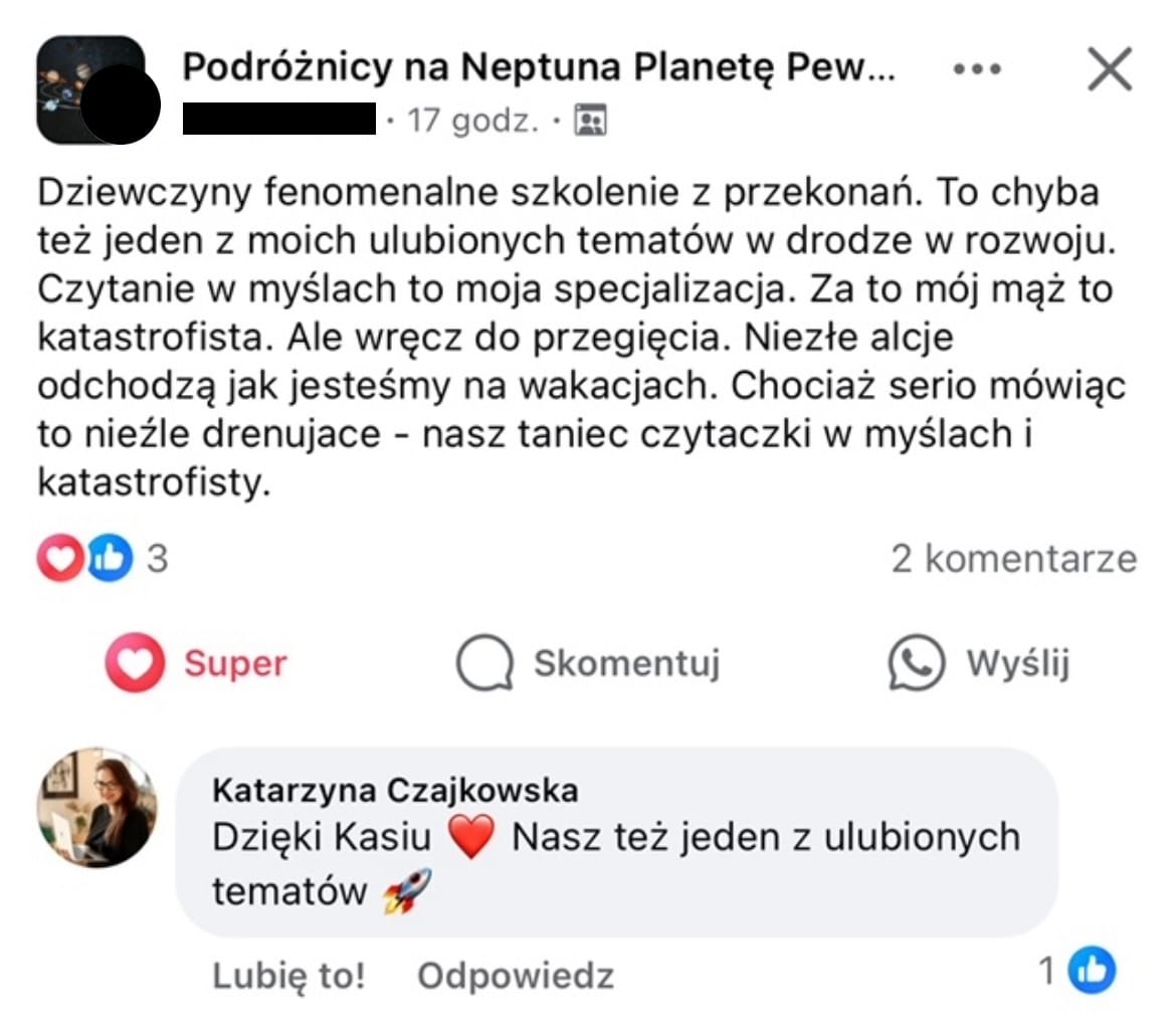 „Dzięki kursowi wreszcie zrozumiałam skąd bierze się moja uległość w relacjach. Moduł o postawach w relacjach otworzył mi oczy na schematy, które kierowały moim zachowaniem. Ćwiczenia między szkoleniami były kluczowe, bo mogłam je na bieżąco wdrażać w życie i obserwować drobne zmiany. Teraz czuję się pewniej, nie pozwalam aby inni mną manipulowali, a moje relacje są znacznie zdrowsze.”