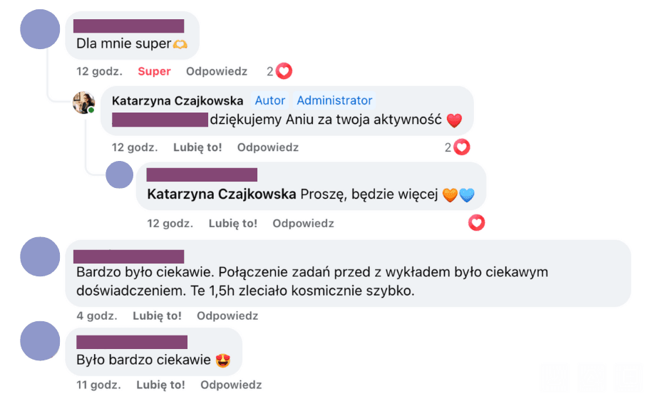 Otrzymasz dostęp do nagrań, z którymi możesz pracować w samodzielnie wybranych momentach i dowolnym tempie. Z chętnymi jesteśmy jednak w kontakcie e-mailowym, na dedykowanej uczestnikom zamkniętej grupie na Facebooku oraz podczas dodatkowych (opcjonalnych) spotkań, o których poinformujemy Cię e-mailowo.